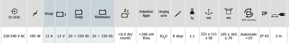 Speziell für 12 V Batterien (Blei-Säure) von 20 bis 250Ah, Erhaltungsladung bis 330Ah möglich.