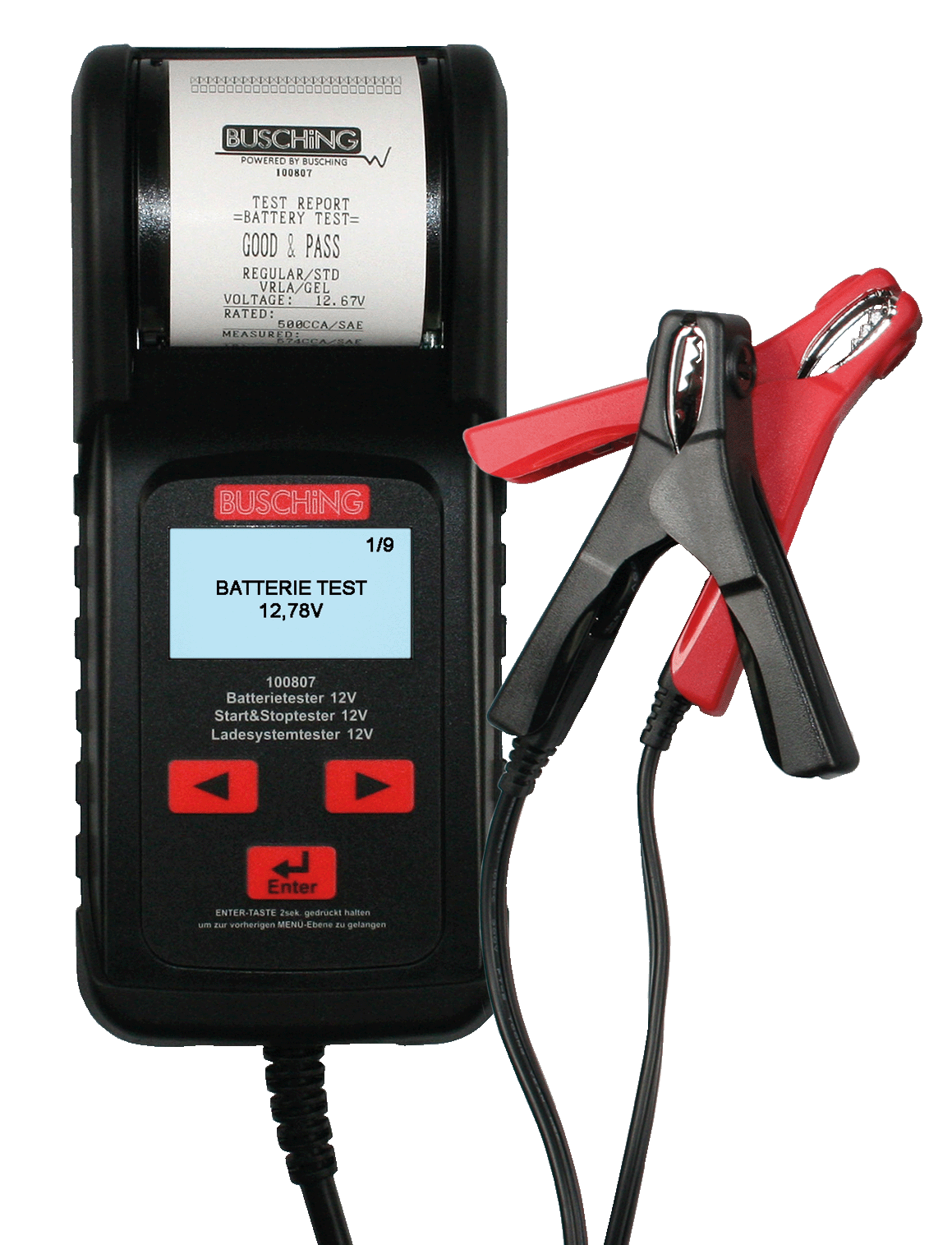 Der Batterietester kann 12 Volt START / STOP / RECUPERATION Starterbatterien EFB (Enhanced Flooded Battery), AGM (Absorbent Glass Mat) und 12 V Starter-Batterien (Blei-Säure-, Gel- und Vlies-Batterien / AGM) testen. Weitere Möglichkeiten sind Start / Ladesystem-Tests für 12 / 24 V Anlagen. Ein integrierter Thermodrucker stellt alle Messergebnisse übersichtlich in Text und grafischer Form in gewählter Menüsprache dar.