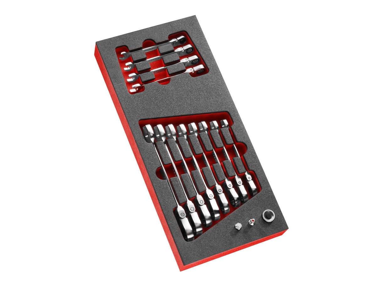 Modul mit 12 Maul- und Ringratschenschlüsseln mit Gelenk in Schaumstoffeinlage