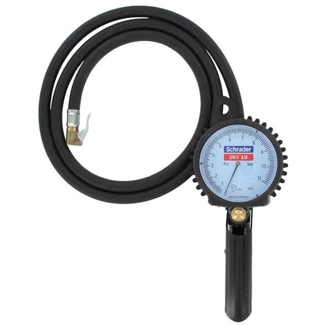 Reifenfüller mit 150 cm Füllschlauch, Momentstecker und gut ablesbarer Skala mit 0,1 bar Teilung. Gummigeschütztes Manometer und geschützter Ablassknopf zur Druckabsenkung oberhalb am Bedienhebel.